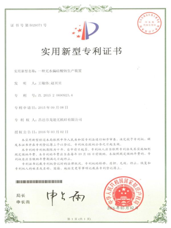 科技成果 科技創(chuàng)新平臺(tái) TECHNOLOGICAL HOME-TECHNOLOGICAL Utility model patent certificate Related Information New Silicon Based Flame RetardantLiquid Potassium SilicateSodium OrthosilicateSodium Silicate LiquidSodium Metasilicate Pentahydrate